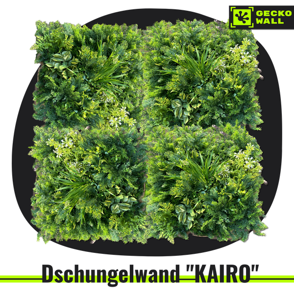 Die GeckoWalls machen sich sowohl im eigenen Zuhause, als auch in Gastronomiebetrieben und anderen gewerblichen Einrichtungen sehr gut. Außerdem können die Paneele Outdoor eingesetzt werden: Als Sichtschutz am Zaun, zur Verschönerung einer Außenwand und vielem mehr. KAIRO ist im Dschungel/Farn-Stil gehalten und sorgt in seiner Umgebung für echten Regenwald-Charme Der Preis ist hier pro 50x50cm Quadrat/Stück. Die Quadrate lassen sich per durchdachten Clips auf der Rückseite verbinden, sodass eine richtige Pflanzenwand entstehen kann. Für die Montage an Wänden sind Aussparungen vorhanden. Zur sicheren Wandbefestigung liefern wir 3 je Stück GeckoNails mit. An Zäunen lassen sich die Paneele wunderbar mit Kabelbindern befestigen.