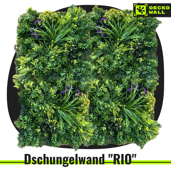 Die GeckoWalls machen sich sowohl im eigenen Zuhause, als auch in Gastronomiebetrieben und anderen gewerblichen Einrichtungen sehr gut. Außerdem können die Paneele Outdoor eingesetzt werden: Als Sichtschutz am Zaun, zur Verschönerung einer Außenwand und vielem mehr. RIO ist im Dschungel/Farn-Stil gehalten und setzt farblich auf ein dunkleres Grün mit Akzenten in Gelb und Lila. Die 50x50cm Quadrate lassen sich per durchdachten Clips auf der Rückseite verbinden, sodass eine richtige Pflanzenwand entstehen kann. Für die Montage an Wänden sind praktische Aussparungen auf der Rückseite vorhanden. Die Montage kann mittels mitgelieferter Haken, oder herkömmlichen Nägeln erfolgen. Die Pflanzenwände sind UV-resistent, geruchsneutral und behalten auch über die Jahre ihre Form- und Farbe. Es können verschiedene GeckoWall-Varianten miteinander kombiniert werden, um mehr Variation ins Spiel zu bringen. Eine hohe Detailtreue und Qualität sorgen dafür, dass die Dschungelwände täuschen echt aussehen. Wer ein richtiges Bild aus den GeckoWalls entstehen lassen will, baut am besten einen Rahmen um die Paneele herum. Hierfür eignen sich die Pflanzenwände wunderbar.