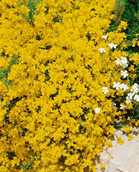 Genista lydia, der Lydische Ginster, ist ein kompakt wachsender Blütenstrauch, der mit leuchtend gelben Blüten im späten Frühjahr bis zum Frühsommer begeistert und als niedriger Zierstrauch jeden Garten elegant aufwertet. Der dicht verzweigte Kleinstrauch bildet bogig überhängende, grün glänzende Triebe mit sehr feinem Laub, das je nach Winter teils wintergrün bleibt. Seine üppige Blütenfülle im Mai bis Juni setzt starke Farbakzente und wirkt besonders malerisch, wenn die Triebe kaskadenartig über Mauerkronen, Trockenmauern oder Hangkanten fallen. Durch den breiten, teppichartigen Wuchs eignet sich der Lydische Ginster hervorragend für Steingärten, Vorgärten, sonnige Beete und als robuster Bodendecker; ebenso kommt er als Solitär im kleinen Garten oder als Kübelpflanze auf Terrasse und Balkon eindrucksvoll zur Geltung. Als pflegeleichter Gartenstrauch schätzt Genista lydia einen vollsonnigen, warmen Standort und sehr gut durchlässige, eher sandig-kiesige, nährstoffarme Böden; Staunässe ist unbedingt zu vermeiden, weshalb auf schweren Lehmböden Drainage sinnvoll ist. Nach der Blüte empfiehlt sich ein leichter Rückschnitt der Triebspitzen, um die kompakte Form zu erhalten; ein starker Schnitt ins alte Holz wird nicht vertragen. Der Lydische Ginster gilt als trockenheitsverträglich nach der Etablierung und benötigt nur selten zusätzliche Wassergaben. In Gruppenpflanzung harmoniert er mit mediterranen Partnern wie Lavendel, Thymian oder niedrigem Ziersalbei und verleiht sonnigen Pflanzungen eine natürliche, dauerhafte Struktur.