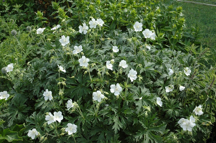 Geranium maculatum ‘Album’, der weiße Flecken-Storchschnabel, ist eine elegante Gartenstaude mit natürlichem Charme und zuverlässiger Blütenfreude. Die Sorte präsentiert von Mai bis Juli zahlreiche schalenförmige, reinweiße Blüten mit feinen, kaum sichtbaren Adern über frischgrünem, tief gelapptem Laub. Der horstige, kompakte Wuchs bleibt übersichtlich und bildet mit 40 bis 60 cm Höhe und ähnlicher Breite einen harmonischen, locker gefügten Blütenhorst, der sowohl in klassischen Beeten als auch am Gehölzrand überzeugt. Das filigrane, handförmige Blattwerk sorgt auch nach der Blüte für Struktur; eine dezente Herbstfärbung unterstreicht den natürlichen Charakter dieser Blütenstaude.