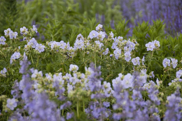 Geranium pratense ‘Mrs Kendall Clark’, der elegante Wiesen-Storchschnabel, ist eine charakterstarke Gartenstaude, die mit zarten, schalenförmigen Blüten in hell lavendelblau bis silbrigviolett und feiner, weißlicher Aderung begeistert. Von Juni bis Juli setzt die bewährte Blütenstaude luftige Farbakzente im Staudenbeet; ein Rückschnitt nach der Hauptblüte fördert frisches Laub und oft eine lockere Nachblüte im Spätsommer. Der Wuchs ist locker aufrecht und buschig, erreicht etwa 60 bis 80 cm Höhe und bildet standfeste Horste, die sich in Gruppenpflanzung ebenso eindrucksvoll zeigen wie als Solitär im Vorgarten. Das tief handförmig gelappte, frischgrüne Laub unterstreicht den reizvollen Cottage-Charakter und kann im Herbst warme Gelbtöne annehmen. Als vielseitige Beetstaude passt ‘Mrs Kendall Clark’ hervorragend in Rabatten, Bauerngärten, naturnahe Pflanzungen und an den Gehölzrand, harmoniert mit Rosen, Rittersporn, Katzenminze und zarten Ziergräsern und eignet sich auch als robuste Kübelpflanze auf Terrasse oder Balkon. Der Standort sollte sonnig bis halbschattig sein, der Boden durchlässig, humos und frisch bis mäßig trocken; auf normalem Gartenboden zeigt sich die Staude besonders zuverlässig und langlebig. Regelmäßiges Ausputzen, gelegentliches Teilen zur Verjüngung und ein leichter Nährstoffschub im Frühjahr genügen für eine üppige Blüte. Winterhart, vital und formschön verbindet dieser Wiesen-Storchschnabel romantische Leichtigkeit mit unkomplizierter Pflege und setzt als Blütenstaude im Beet, in Kombination mit Zierstrauch-Rändern oder in der Gruppenpflanzung dauerhaft stilvolle Akzente.