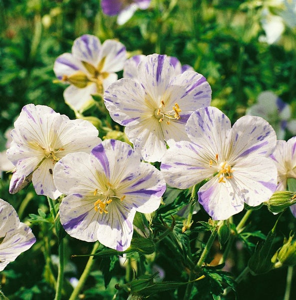 Geranium pratense ‘Splish Splash’, der Wiesen-Storchschnabel, ist eine außergewöhnliche Gartenstaude, die mit ihren weißgrundigen, blau bis violett gesprenkelten und marmorierten Blüten sofort ins Auge fällt. Die unvorhersehbare Zeichnung jeder einzelnen Blüte macht diesen Storchschnabel zu einem charaktervollen Zierstauden-Klassiker für Beet und Rabatte. Von Juni bis Juli, oft mit zarter Nachblüte nach einem Rückschnitt, präsentiert der horstig wachsende Blütenstauden-Typ einen üppigen Flor über frischgrünem, tief gelapptem Laub, das bis in den Herbst attraktiv bleibt und vereinzelt eine dezente Färbung annimmt. Mit einer Höhe von etwa 60–80 cm und einer buschigen, standfesten Wuchsform eignet sich diese Staude perfekt als Begleitpflanze zu Rosen, Salvia, Katzenminze oder Ziergräsern, setzt als Solitär im Vorgarten eindrucksvolle Akzente und überzeugt in der Gruppenpflanzung als flächendeckender Blütenstauden-Partner. Auch im großen Kübel auf Terrasse oder Balkon ist dieser vielseitige Gartenstrauch im Staudenformat eine reizvolle Kübelpflanze, sofern ein gleichmäßig frisches, gut durchlässiges, humoses Substrat zur Verfügung steht. Ein sonniger bis halbschattiger Standort fördert eine reiche Blüte; in vollsonnigen Lagen ist bei länger anhaltender Trockenheit gelegentliches Wässern empfehlenswert. Ein Rückschnitt nach der Hauptblüte regt eine kompaktere Nachtriebsbildung an und verlängert die Attraktivität der Pflanze. Insgesamt erweist sich Geranium pratense ‘Splish Splash’ als robuste, langlebige Zierstaude, die im Bauerngarten ebenso stimmig wirkt wie im modernen Staudenbeet und jede Pflanzung mit spontaner, malerischer Farbdynamik bereichert.