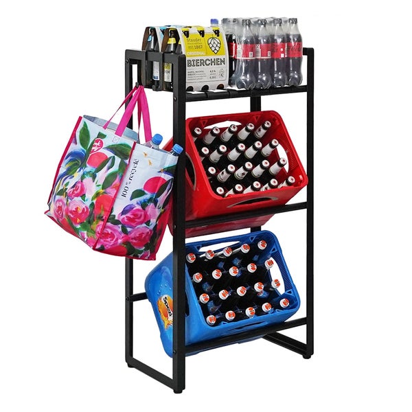 Die 3 Lagerebenen bieten Platz für jeweils 1 Getränkekiste und ermöglichen so eine übersichtliche und gut organisierte Lagerung. Für noch mehr Flexibilität sind 6 abnehmbare Auflageträger im Lieferumfang enthalten, mit denen sich auch kleinere Flaschen oder Sixpacks sicher verstauen lassen. Zusätzlich verfügt das Regal über 2 seitlich anbringbare Haken, die sich ideal zum Aufhängen von Leergutbeuteln oder Einkaufstaschen eignen.