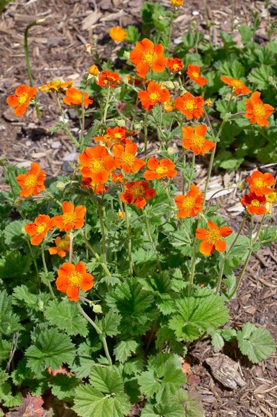 Geum coccineum ‘Werner Arends’, die rote Nelkenwurz, ist eine robuste, horstig wachsende Gartenstaude, die mit leuchtend orange- bis scharlachroten Blüten und goldgelben Staubgefäßen den Frühsommer zum Strahlen bringt. Von Mai bis Juli erscheinen zahlreiche, leicht halbgefüllte Blüten über frischgrünem, teilweise wintergrünem Laub, oft mit williger Nachblüte bei regelmäßigem Ausputzen. Die kompakte Wuchsform mit aufrechten, zarten Stielen erreicht etwa 30 bis 40 cm Höhe und bleibt angenehm übersichtlich, sodass diese Zierstaude ideal für den vorderen Beetbereich, den Rand von Rabatten und den Vorgarten ist. Als Beetstaude im Bauerngarten, am sonnigen Steingartenrand oder als zierliche Kübelpflanze auf Terrasse und Balkon setzt sie freundliche Farbakzente und harmoniert hervorragend mit Begleitern wie Salvia, Nepeta, Alchemilla, Stipa oder Geranium. Ein sonniger bis halbschattiger Standort fördert die üppige Blüte, der Boden sollte durchlässig, humos und gleichmäßig frisch sein, Staunässe wird nicht vertragen, längere Trockenheit mindert die Blühfreude. Eine lockere Abdeckung mit Mulch hält die Feuchtigkeit, während ein moderater Nährstoffnachschub im Frühjahr das Wachstum unterstützt. Verblühte Stiele regelmäßig entfernen, um die Nachblüte zu verlängern, und nach der Hauptblüte ein leichter Rückschnitt zur Vitalisierung ist vorteilhaft. Ältere Horste lassen sich im Abstand einiger Jahre teilen, wodurch die Pflanze verjüngt und die Blühstärke erhalten wird. In Gruppenpflanzungen bringt diese vielseitige Staude lebendige Struktur, als kleiner Solitär setzt sie klare Akzente und sorgt für ein dauerhaft gepflegtes Bild im Zierbeet.