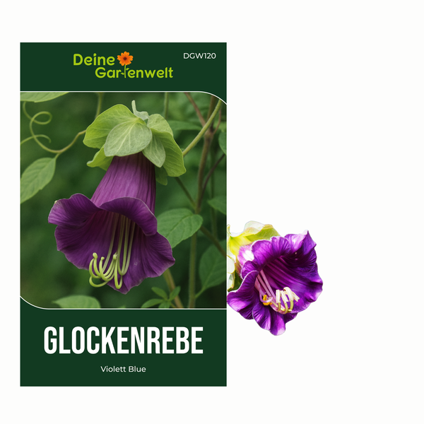 Einjährige, bis zu 3 m hohe Rankpflanze. Die großen, prächtigen Blütenglocken blühen von weiß-grün nach blau-violett ab. Ideal für Zäune, Spaliere und große Kübel.