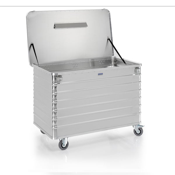 Hinweis: Diesen Artikel erhalten Sie als Speditionslieferung direkt vom Hersteller. Bitte geben Sie uns unbedingt eine Telefonnummer für die Spedition an. Des Weiteren kann dieser Artikel NUR innerhalb Deutschlands versendet werden. (This item can ONLY be shipped within Germany) Glatte Oberfläche Umlaufende, sehr stabile Randprofile oben und unten sorgen für eine dauerhafte Wagenform Extrem stabile, formschlüssige Clinch-Verbindung der Aluminiumprofile mit den Wänden Wände durch umlaufende trapezförmige Sicken verstärkt Anscharnierter Deckel mit 2 Gurtbändern und Einwurfschlitz 420 x 27 mm mit Entnahmesicherung 1, bzw. 2 Hebelspannverschlüsse mit Zylinderschloss Stabile Fahrwerksträger aus verzinktem Stahl Radgehäuse aus verzinktem Stahl, Räder mit spurloser Vollgummibereifung, Rollenlagerung und Fadenschutz Feststeller an den Lenkrollen, gemäß der Europäischen Norm EN 1757-3