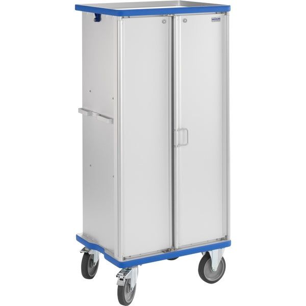 Hinweis: Diesen Artikel erhalten Sie als Speditionslieferung direkt vom Hersteller. Bitte geben Sie uns unbedingt eine Telefonnummer für die Spedition an. Des Weiteren kann dieser Artikel NUR innerhalb Deutschlands versendet werden. (This item can ONLY be shipped within Germany) Eloxierte Oberfläche Wände und Aluminiumprofile sind durch Clinchen formschlüssig und damit extrem stabil verbunden Offene Korpusseite mit umlaufendem Profilrahmen Zwei hochsteife Flügeltüren, 3 mm stark, um 270 Grad schwenkbar Sicherung der offenen Türen durch Magnete Bedienungsfreundlicher zentraler Einhand-Drehverschluss garantiert sicher verschlossene Türen, sogar während eines LKW-Transports Gute Geräuschdämmung und Staubschutz durch integrierte, umlaufende EPDM-Dichtung an den Türen, am Boden- und Dachprofil Glatter Innenraum ohne Hinterschneidungen für einfaches Handling und Reinigung Ergonomische Zieh- und Schiebegriffe an beiden Stirnseiten Umlaufender, abriebfester, blauer PVC-Stoßpuffer am oberen und unteren Wagenrand Herausnehmbare Fachböden bilden gleichhohe Ablagefächer, jeder Fachboden bis 100 kg vollflächig belastbar Schilderrahmen DIN A4 an Türinnenseite und DIN A7 an Wagenstirnseite Verwindungssteifer Wagenunterbau durch BiTubAl®-System Radgehäuse aus verzinktem Stahl, Supratech Räder, Radkörper aus Polypropylen, thermoplastischer Gummi-Laufbelag, spurlos, Präzisionskugellager