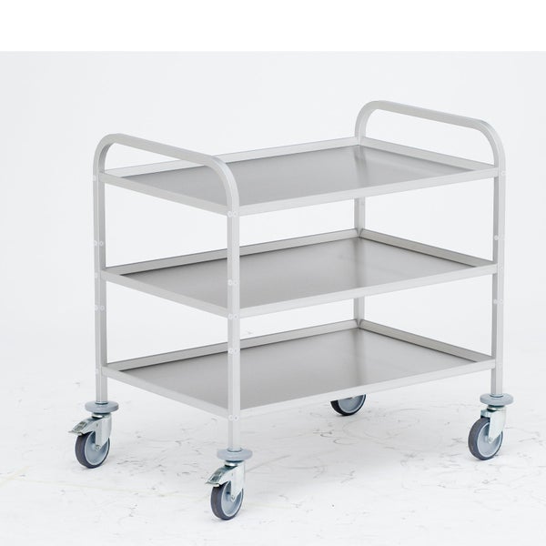 Hinweis: Diesen Artikel erhalten Sie als Speditionslieferung direkt vom Hersteller. Bitte geben Sie uns unbedingt eine Telefonnummer für die Spedition an. Des Weiteren kann dieser Artikel NUR innerhalb Deutschlands versendet werden. (This item can ONLY be shipped within Germany) Modularer Aufbau wahlweise mit 2, 3 oder 4 Böden In 2 Größen lieferbar Geschliffene Edelstahl-Böden Böden mit umlaufendem, erhöhten Profilrand aus eloxiertem Aluminium Boden vollflächig bis 60 kg belastbar Stirnseitige Säulen aus eloxiertem Aluminium-Vierkantprofil 25 x 25 mm dienen gleichzeitig als Griff Böden mit den Schiebebügeln verschraubt 5 Befestigungspositionen ermöglichen variable Bödenabstände 4 graue Stoßschutzscheiben mit Ø-100 mm an jedem Rad Radgehäuse aus verzinktem Stahl, Räder mit thermoplastischen Gummilaufbelag und Gleitlager