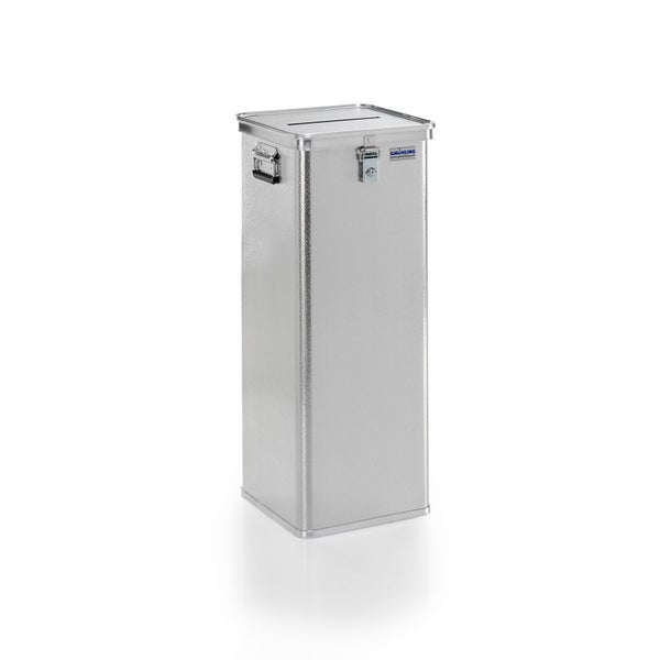Hinweis: Diesen Artikel erhalten Sie als Speditionslieferung direkt vom Hersteller. Bitte geben Sie uns unbedingt eine Telefonnummer für die Spedition an. Des Weiteren kann dieser Artikel NUR innerhalb Deutschlands versendet werden. (This item can ONLY be shipped within Germany) Strukturierte, sehr kratzfeste Oberfläche Umlaufende, sehr stabile Profile am Behälterrand, Boden und Deckel Anscharnierter Deckel mit Einwurfschlitz 250 x 20 mm und umlaufender Gummidichtung 1 Hebelspannverschluss mit Zylinderschloss; Löcher zum Verplomben der Behälter vorhanden Je 1 stabiler Federfallgriff an 2 Seiten Eckradius 30 mm Stapelbar