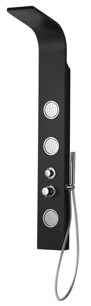Wellness in Ihrer Dusche ist jetzt einfach realisierbar! Dieses Duschsystem kombiniert modernes, ansprechendes Design mit höchster Funktionalität. e Duschsäule aus schwarzem Aluminium verfügt über eine integrierte Kopfbrause, eine flexible Handbrause sowie drei Massagedüsen für eine entspannende Rückenmassage. Dank der praktischen Bedienknöpfe lassen sich die Wasserintensität und Temperatur leicht regulieren. Mit dieser multifunktionalen Duschsäule genießen Sie Wellness direkt zu Hause, während das moderne, schlanke Design jedes Badezimmer optisch aufwertet. Die Säule ist mit einer Höhe von 155 cm und einer Breite von 21 cm ideal für alle Standardduschen.