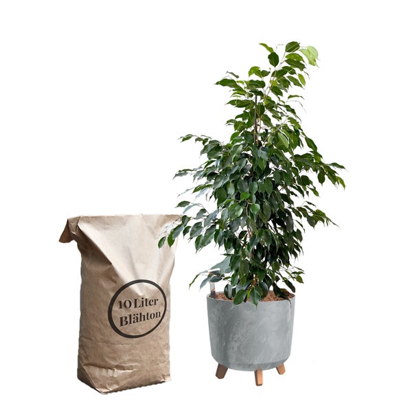 Green Me Up Hydro Set XL Büropflanze Ficus Benjamina mit Pflanzgefäß in Betonoptik Grau, XL Büropflanze Ficus in Vase, 100-110