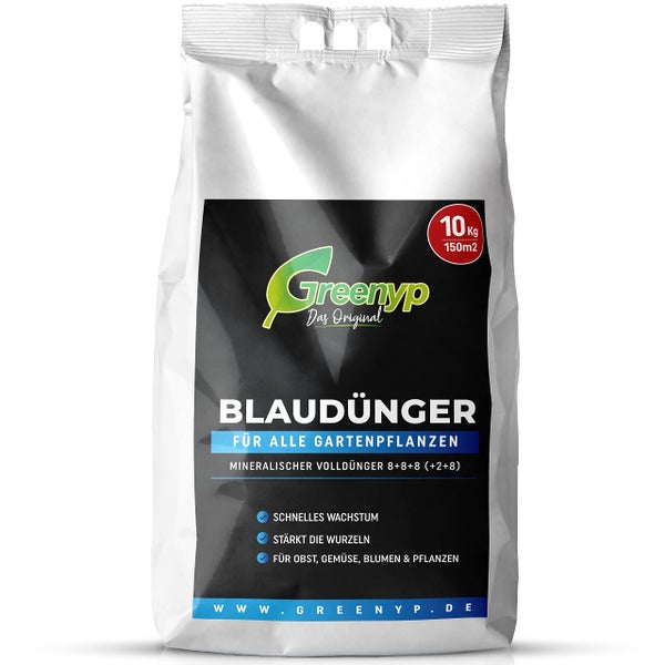 - ArtikelbeschreibungGreenyp Blaudünger ist ein hochwertiger, mineralischer Volldünger, der speziell auf die Bedürfnisse von Pflanzen abgestimmt wurde. Egal ob Obst, Gemüse, Blumen, Rasen oder Zimmer- & Balkonpflanzen – unser Blaukorn Dünger ist universal einsetzbar und versorgt Ihre Pflanze effektiv mit allen wichtigen Nährstoffen. Mit einem hohen Anteil an Stickstoff und Kalium sorgt dieser Dünger für eine effektive Nährstoffversorgung, kräftigt die Wurzeln und fördert das Wachstum, sowie die Gesundheit Ihrer Pflanzen. Er kann auf verschiedenen Bodenarten eingesetzt werden und ist besonders effektiv bei der Versorgung von anspruchsvollen Pflanzen. Dank seiner granulierten Form und optimalen Zusammensetzung werden die Mineralstoffe schrittweise freigesetzt, was eine kontinuierliche und langanhaltende Wirkung des Düngers sicherstellt.