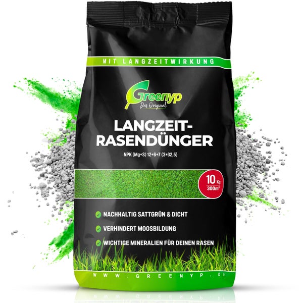 ✔ Enthält wichtige Mineralien für deinen Rasen - ArtikelbeschreibungDer Greenyp Langzeit Rasendünger ist ein Volldünger, der vom Frühjahr bis Spätsommer eingesetzt werden kann und für ein gesundes und dichtes Wachstum Ihres Rasens sorgt. Er erhöht die Beständigkeit der Pflanzen gegen Krankheiten sowie Erfrieren, und verhindert gleichzeitig die Entstehung von Moos und Unkräutern. Der Langzeit Rasendünger ist für alle Rasenarten geeignet. Die granulöse From und optimale Zusammensetzung sorgen dafür, dass die Mineralstoffe schrittweise freigesetzt werden, was eine kontinuierliche und langanhaltende Wirkung des Düngers gewährleistet.