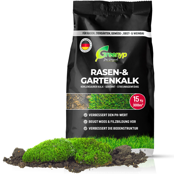 ✔ Verbessert die Bodenstruktur - ArtikelbeschreibungGreenyp Rasen- & Gartenkalk bestehend aus 95% kohlensaurem Kalk und wichtigen Spurennährstoffen eignet sich ideal für Rasenflächen, Ziergärten, Gemüse-, Obst- und Weinbau. Die hohe Löslichkeit sorgt für eine schnelle und nachhaltige Wirkung, während das gleichmäßig gekörnte Granulat staubfrei ist und durch seine Streufähigkeit die Anwendung erleichtert. Die einzigartige Herstellungsformel vereint Sofort- und Depotwirkung, neutralisiert schlechte Bodensäuren effektiv und erhöht den pH-Wert. Dies schützt vor Übersäuerung, fördert ideale Wachstumsbedingungen, verdrängt Moos im Rasen und verbessert die Bodenstruktur. Darüber hinaus, lockert er schwere Böden und optimiert die Zirkulation von Wasser, Luft und Wärme.
