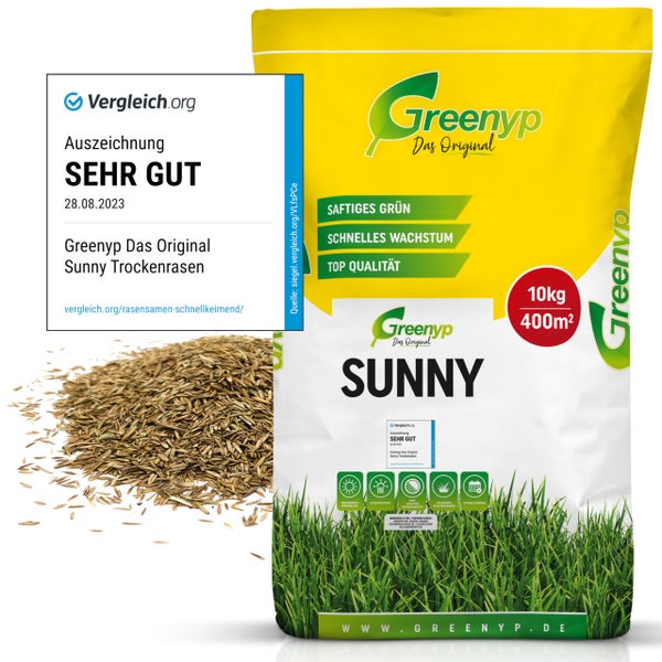 Greenyp Sunny I Dürreresistenter Trockenrasen I 10kg für 400m² I Grassamen Rasensamen Rasensaat Gras Nachsaat schnellkeimend