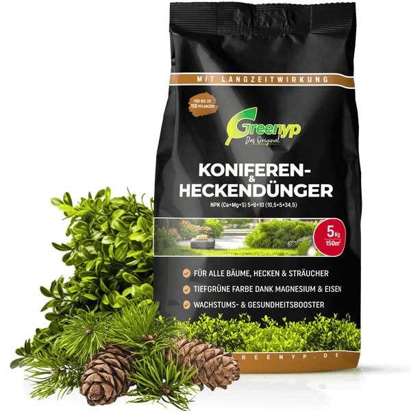 Der Greenyp Koniferen- & Heckendünger ist ein mineralischer Spezialdünger für den Einsatz von Frühjahr bis Spätsommer. Die perfekt abgestimmte Mischung erfüllt die Bedürfnisse aller Nadelgehölze wie Fichten, Kiefern, Tannen, Thuja, Wacholder, Eiben, Zypressen und mehr. Der Dünger fördert Wachstum, verbessert Gesundheit und steigert die Trockenheits- sowie Frostbeständigkeit. Das im Produkt enthaltene Eisen und Magnesium garantieren eine satte, grüne Farbe und verhindern das Braunwerden der Nadeln. Die granuläre Form und optimale Zusammensetzung gewährleisten eine schrittweise Freisetzung der Mineralstoffe für eine kontinuierliche, langanhaltende Wirkung.