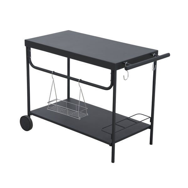 Dieser erstklassige Serviertisch begeistert durch seine Funktionalität. Durch zwei robuste Rollen ist ein leichtes Handling möglich. Die Highlights sind der Gitterkorb sowie der Flaschenhalter und die Haken für z.B. Grill-Besteck. Der Tisch schafft zusätzliche Ablagefläche für das beliebte Outdoor-Cooking und Grillen.