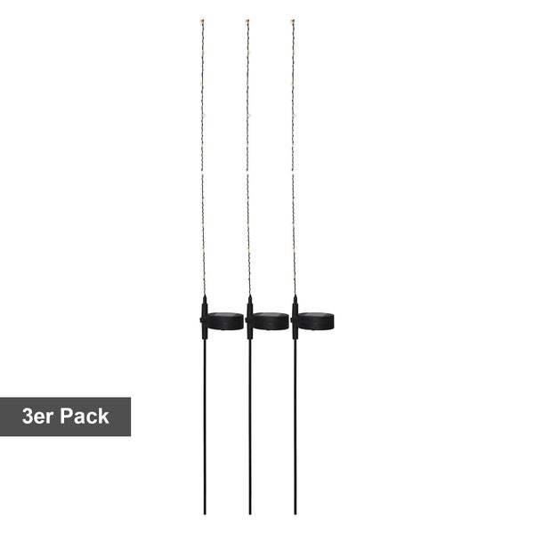 - Dieses 3er Set Gartenspieße besteht jeweils aus einem schwarzen dünnen Stab, welcher mit 10 kleinen LEDs und einem integrierten Solarpanel bestückt ist