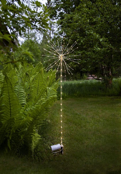 - Der LED-Dekostab besteht aus einem Leuchtenkopf in Feuerwerksform mit Lichterketten, welche auf einem transparenten Erdspieß befestigt wurden