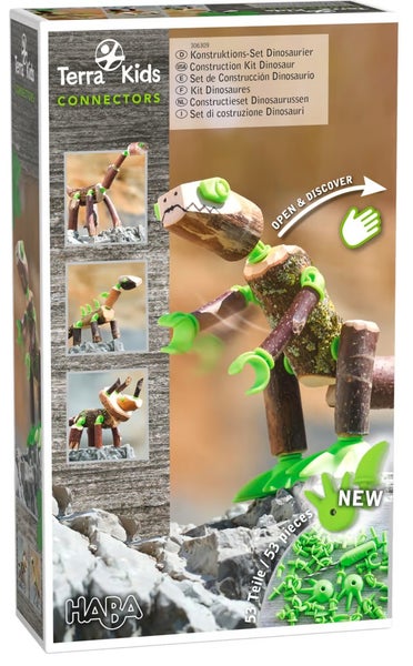 Jeder Dino ist ein Unikat! Mit dem Konstruktions-Set Dinosaurier aus der beliebten Terra Kids Connectors-Serie von HABA bauen Kinder fantastische Urzeitwesen aus Naturmaterialien. Rausgehen, sammeln, bohren, sägen, stecken: Mit großem Tüftel-Spaß entstehen aus Ästen, Blättern, Federn und Kork bewegliche Figuren mit den robusten Verbindungsstücken. Das Konstruktions-Set Dinosaurier besteht aus einem Handbohrer für Kinder und vielen Verbindungs- und Endstücken. Das Anleitungsheft zeigt, wie vier spannende Dinos zusammengesetzt werden können. Es enthält auch viele Anregungen für weitere Konstruktionen. Mit dem genialen Bausatz stellen Kinder ihre eignen Dinosaurier-Figuren und fantasievolles Naturspielzeug her. Draußen ist besser Terra Kids