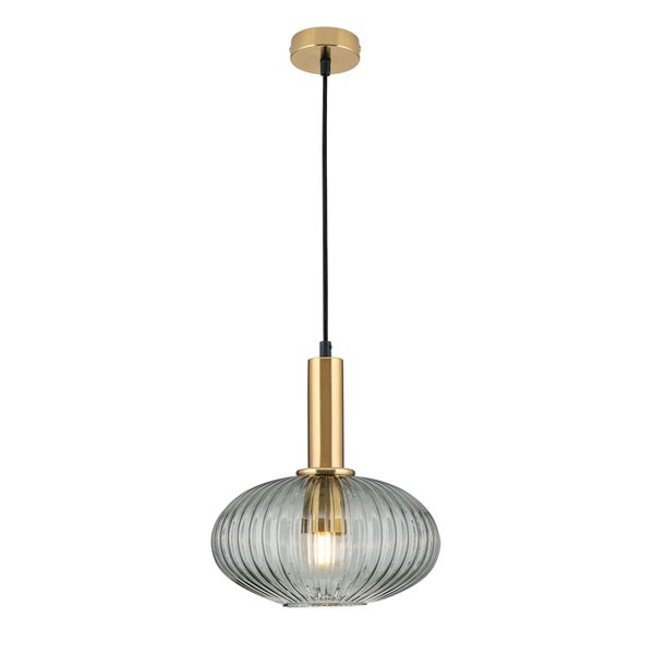 Der Lampenschirm aus rauchfarbenem Glas beeindruckt durch sein einzigartiges Rillendekor, das ein faszinierendes Spiel von Licht und Schatten erzeugt. Die raffinierte Struktur des Glases verleiht der Leuchte eine besondere Tiefe und Eleganz. Die Rosette und der Körper der Leuchte sind in edlem Patina-Finish gehalten, was einen charmanten Vintage-Look erzeugt. Die Patina-Farben verleihen der Hängeleuchte einen Hauch von Nostalgie und passen perfekt zu verschiedenen Einrichtungsstilen. Das schwarze Textilkabel unterstreicht den modernen Aspekt des Designs und bietet gleichzeitig Flexibilität und Haltbarkeit. Das Kabel fügt sich harmonisch in das Gesamtbild der Leuchte ein.