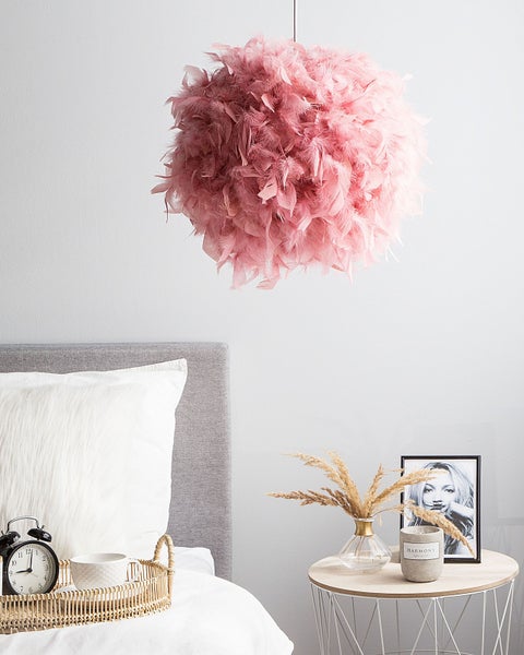 Federleichte Hängelampe in Rosa. Schaffen Sie sich eine Wohlfühloase mit dieser bezaubernden Hängelampe. Sie füllt den Raum mit einem wunderbar dezenten und warmen Licht, perfekt zum Entspannen und Kuscheln. Dank der flauschigen, mit echten Truthahnfedern bedeckten Oberfläche ist die Lampe ein wunderschönes Wohnaccessoire mit romantischer und extravaganter Note. Details: Typ Kinderleuchten. Farbe: Rosa. Material: Federn. Material: Entenfedern. Zusätzliches Material: Kunststoff. Material Lampenschirm: Entenfedern. Fassung: Max. 40 W. Schutzklasse: IP 20. Anzahl der Glühbirnen: 1. Spannung 230 V (50 Hz). Abmessungen: Kabellänge: 110 cm. Tiefe: 40 cm. Breite: 40 cm. Höhe: 154 cm. Gewicht: 1 kg. .Sie kaufen: 1 x Hängeleuchte, Nicht im Lieferumfang enthalten: Leuchtmittel. Produktvorteile: Ruhespendendes Licht, Kabellänge kann von einem Elektriker angepasst werden, Sorgt für eine gleichmäßige Beleuchtung des Raumes, Gut kombinierbar mit vielen Einrichtungsstilen, Ein einzigartiger Hingucker, Dekorativ und zugleich funktional, Hochwertiges Material. Montage: Installation benötigt.5 - 15 Min. Zusatzinformationen: Diese Leuchte ist geeignet für Leuchtmittel der Energieklassen A bis G auf einer Skala von A (sehr effizient) bis G (weniger effizient). Geeignet für: LED Leuchtmittel, Eco-Halogen Leuchtmittel, Energiesparleuchtmittel. Die Stromkabel dürfen nur von einem qualifizierten Elektriker angepasst werden. Hinweis! Beschädigungsgefahr! Bitte verwenden Sie keine Messer oder andere spitze oder scharfe Gegenstände, um die Verpackung zu öffnen, da das Produkt sonst beschädigt werden könnte. Pflegeanleitung: Entenfedern: 1.Die Reinigung sollte ausschließlich mit einem weichen, trockenen Tuch und ohne Reinigungsmittel erfolgen. Kunststoff: 1.Bitte ausschließlich milde Reinigungsmittel und weiche Tücher verwenden. Feuchte Stellen sofort trocken reiben.