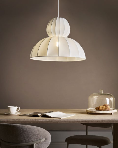Handgefertigte Hängelampe mit Schirm in Seidenoptik. Diese handgefertigte Pendelleuchte verbindet Eleganz mit Minimalismus und wertet jedes Zuhause stilvoll auf. Der Schirm aus langlebigem Stoff in Seidenoptik macht die Hängeleuchte zu einem stilvollen Blickfang, der für eine warme Atmosphäre im Raum sorgt. Ideal geeignet für moderne Essbereiche, Wohnzimmer oder minimalistisch eingerichtete Schlafzimmer. Details: Typ Pendelleuchten. Stil: Minimalistisch. Farbe: Weiß. Material: Kunststoff. Material: Kunstseide. Zusätzliches Material: Eisen. Material Lampenschirm: Kunststoff. Zusammenstellung: 100% Polyester. Fassung: Max. 40 W. Anzahl der Glühbirnen: 1. Spannung 230 V (50 Hz). Abmessungen: Kabellänge: 80 cm. Tiefe: 47 cm. Breite: 47 cm. Höhe: 108 cm. Gewicht: 1 kg. .Sie kaufen: 1 x Hängeleuchte, Nicht im Lieferumfang enthalten: Leuchtmittel. Produktvorteile: Sorgt für eine gleichmäßige Beleuchtung des Raumes, Ein einzigartiger Hingucker, Modernes Design, Handgefertigte Präzision, Besonders pflegeleicht und langlebig. Montage: Erfordert Installation und Montage.5 - 15 Min. Zusatzinformationen: Diese Leuchte ist geeignet für Leuchtmittel der Energieklassen A bis G auf einer Skala von A (sehr effizient) bis G (weniger effizient). Geeignet für: LED Leuchtmittel, Eco-Halogen Leuchtmittel, Energiesparleuchtmittel. Hinweis! Beschädigungsgefahr! Bitte verwenden Sie keine Messer oder andere spitze oder scharfe Gegenstände, um die Verpackung zu öffnen, da das Produkt sonst beschädigt werden könnte. Jeder Artikel ist ein handgefertigtes Unikat; Farbschattierung und Muster können daher vom Foto abweichen. Pflegeanleitung: Kunstseide: 1.Bitte ausschließlich milde Reinigungsmittel und weiche Tücher verwenden. Feuchte Stellen sofort trocken reiben. Eisen: 1.Bitte ausschließlich handelsübliche, milde Reinigungsmittel und weiche Tücher verwenden, wobei feuchte Stellen sofort trocken gerieben werden sollten. 2.Vermeiden Sie scheuernde Reiniger, da diese die Oberfläche beschädigen können. 3.Bei Chrom und Kupfer regelmäßig mit speziellen Pflegemitteln polieren.