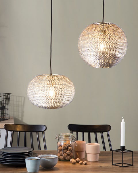 Elegante Hängelampe mit Pailletten in Silber. Die Hängelampe bringt jeden Raum zum Strahlen. Die Pailletten in Silber, die schuppenartig angeordnet sind, reflektieren das Sonnenlicht. Diese Pendellampe fällt durch ihren Glanz in jedem Raum auf und kann mit unterschiedlichen Einrichtungsstilen kombiniert werden. Die Lampe hängt an einem matt schwarzen Kabel herunter. Details: Typ Pendelleuchten. Farbe: Silber. Material: Metall. Material: Eisen. Zusätzliches Material: Kunststoff. Material Lampenschirm: Metall. Fassung: Max. 40 W. Schutzklasse: IP 20. Anzahl der Glühbirnen: 1. Spannung 230 V (50 Hz). Abmessungen: Kabellänge: 120 cm. Tiefe: 32 cm. Breite: 32 cm. Höhe: 146 cm. Gewicht: 1.5 kg. .Sie kaufen: 1 x Hängeleuchte, Nicht im Lieferumfang enthalten: Leuchtmittel. Produktvorteile: Ruhespendendes Licht, Kabellänge kann von einem Elektriker angepasst werden, Sorgt für eine gleichmäßige Beleuchtung des Raumes, Elegante Akzente für Ihr Heim, Gut kombinierbar mit vielen Einrichtungsstilen, Leichtes und zugleich strapazierfähiges Material. Montage: Erfordert Installation und Montage.20 - 40 Min. Zusatzinformationen: Diese Leuchte ist geeignet für Leuchtmittel der Energieklassen A bis G auf einer Skala von A (sehr effizient) bis G (weniger effizient). Geeignet für: LED Leuchtmittel, Eco-Halogen Leuchtmittel, Energiesparleuchtmittel. Die Stromkabel dürfen nur von einem qualifizierten Elektriker angepasst werden. Pflegeanleitung: Metall: 1.Bitte ausschließlich handelsübliche, milde Reinigungsmittel und weiche Tücher verwenden, wobei feuchte Stellen sofort trocken gerieben werden sollten. 2.Vermeiden Sie scheuernde Reiniger, da diese die Oberfläche beschädigen können. 3.Bei Chrom und Kupfer regelmäßig mit speziellen Pflegemitteln polieren.