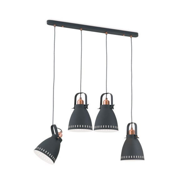 Die Hängeleuchte THEKE verdankt ihren Namen ihrer Funktionalität. Über eine Theke, einen langen Esstisch oder eine Kücheninsel gespannt, lassen sich die Lampenschirme punktgenau auf die gewünschte Höhe und den gewünschten Neigungswinkel einstellen. Die detailverliebte Ausarbeitung bereichert jede Einrichtung: Kupferelemente wechseln ab mit mattschwarz überzogenem Stahl, der durch sachlich-elegant ausgeführte Öffnungen am Leuchtenkopf und am Schirmrand strukturiert wird. Zwei Flügelmuttern sorgen für sicheren Halt, wenn der Schirm in geneigte Stellung gebracht wird. Das zur Montageleiste führende Kabel in Stoffoptik rundet den wertigen Eindruck ab. Viermal bis zu 60 Watt-liefernde Fassungen stehen zur Verfügung und eignen sich für die Bestückung mit LED-Lampen in Glühfadenoptik.