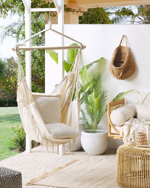 Wunderschöner Boho-Hängesessel. Dieser hübsche und funktionelle Hängesessel ist der perfekte Hingucker für eine Veranda oder einen Wohnbereich. Die Sitzfläche ist aus robustem, hochwertigem Stoff gefertigt und mit stilvollen Quasten am Rand verziert, die für einen Boho-Flair sorgen. An einer Seite befindet sich eine kleine Tasche, die ideal für Gläser oder ein Buch geeignet ist. Zusammen mit den passenden Kissen, die im Lieferumfang enthalten sind, ist die Hängeschaukel ein idealer Platz, um sich einzukuscheln, ein Buch zu lesen oder einfach zu entspannen. Details: Typ Hängesessel. Farbe: Beige. Material: Stoff. Material: Baumwolle. Zusätzliches Material: Stoff. Sitzmaterial: Stoff. Zusammenstellung: 35% Polyester. Schaumstoffdichte: 30 kg/m3. Abmessungen: Tiefe: 55 cm. Breite: 95 cm. Höhe: 125 cm. Gewicht: 2 kg. Max. Belastung: 150 kg. .Sie kaufen: 2 x Kissen, Nicht im Lieferumfang enthalten: Montagesatz, 1 x Aufbewahrungstasche, 1 x Hollywoodschaukel. Produktvorteile: Ausgezeichneter Platz zum Entspannen, Gemütliche Ausstrahlung, Passt ausgezeichnet zu vielen Einrichtungsstilen, Geeignet für den Innen- und Aussenbereich, Stabile Befestigung. Montage: Installation benötigt. Pflegeanleitung: Baumwolle: 1.Flecken können mit einem Polsterreiniger, einem angefeuchteten Schwamm oder milden Reinigungsmitteln entfernt werden. 2.Oberflächen nur mit geeignetem Aufsatz vorsichtig absaugen. 3.Wenn die Textilien nicht verwendet werden, sollten sie an einem sauberen und trockenen Ort vor ungünstigen Witterungseinflüssen geschützt werden. Buchenholz: 1.Bitte ausschließlich milde Reinigungsmittel und weiche Tücher verwenden. Dabei immer in Richtung der Maserung abwischen. Feuchte Stellen sofort mit einem weichen Tuch trocken reiben und Dauernässe bei der Reinigung vermeiden. 2.Geöltes Holz sollte vor der Benutzung und nach der Saison vor der Einlagerung nachgeölt werden, besonders bei feuchtem Klima. 3.Wir empfehlen bei ungünstigen Witterungsbedingungen und für die Wintersaison eine Schutzabdeckung zu verwenden oder, wenn möglich, die Gartenmöbel trocken und kühl drinnen zu lagern.