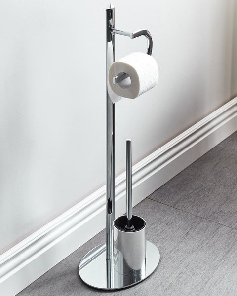 Freistehender, silberner WC-Papierhalter aus hochwertigem Stahl mit Bürste. Dieser hohe Toilettenpapierhalter wird Ihr Bad bzw. Ihr WC gut aufgeräumt halten. Das Modell ist aus robustem Stahl gefertigt und hat ein elegantes Design, das sowohl zu modernen als auch zu klassischen Einrichtungsstilen passt. Der stabile, silberne Ständer ist mit einem praktischen Kunststoff-Bürstenhalter versehen und kann flexibel in jeder freien Ecke des Badezimmers platziert werden. Die Klobürste ist bequem versteckt, so dass keine Gerüche aus der Halterung treten und der optische Gesamteindruck des Bades nicht gestört wird. Details: Typ Toilettenbürste. Stil: Modern. Farbe: Silber. Material: Metall. Material: Stahl. Zusätzliches Material: Kunststoff. Finish: Verchromt. Abmessungen: Tiefe: 20 cm. Breite: 28 cm. Höhe: 78 cm. Gewicht: 2 kg. .Sie kaufen: 1 x Toilettenpapierhalter, 1 x Toilettenbürste. Produktvorteile: Modernes Design, Hohe Qualität, Besonders pflegeleicht und langlebig, Leichtes Gewicht und gut transportierbar, Klein und kompakt, perfekt für begrenzten Platz. Montage: Nicht montiert.5 - 15 Min. Pflegeanleitung: Stahl: 1.Bitte ausschließlich handelsübliche, milde Reinigungsmittel und weiche Tücher verwenden, wobei feuchte Stellen sofort trocken gerieben werden sollten. 2.Vermeiden Sie scheuernde Reiniger, da diese die Oberfläche beschädigen können. 3.Bei Chrom und Kupfer regelmäßig mit speziellen Pflegemitteln polieren.