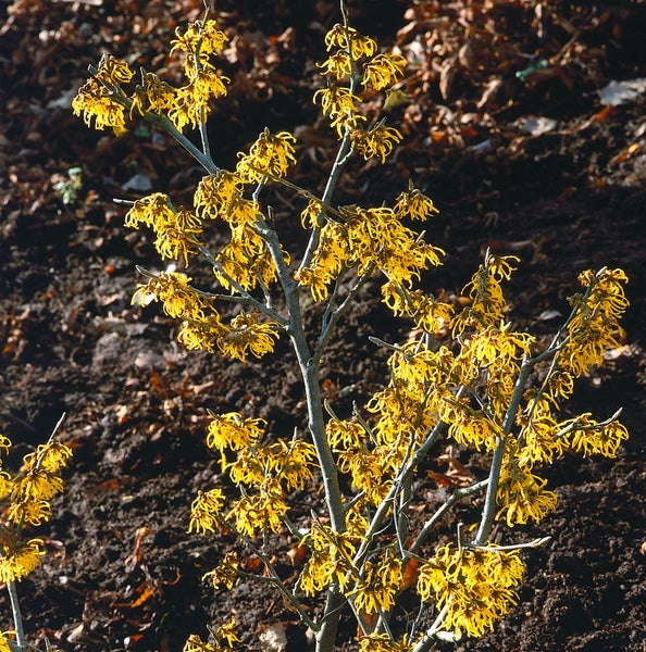 Als Solitärpflanze wirkt die Zaubernuss besonders vor dunklen Immergrünen oder in der Nähe von Wegen und Eingängen, wo die Winterblüte aus nächster Nähe bewundert werden kann. In lockeren Gruppenpflanzungen, im gemischten Strauchbeet oder als freiwachsende, natürliche Blütenhecke bietet sie Struktur und saisonalen Reiz; in großen Kübeln auf Terrasse und Sitzplatz lässt sie sich ebenfalls wirkungsvoll inszenieren. ‘Arnold Promise’ bevorzugt einen sonnigen bis halbschattigen Standort, humosen, leicht sauren bis neutralen, gut durchlässigen Boden und gleichmäßige, frische Feuchte ohne Staunässe. Ein windgeschützter Platz fördert die frühe Blüte. Die Wurzeln liegen eher flach, daher den Boden nicht stark bearbeiten und eine schützende Mulchschicht aufbringen. Rückschnitte sind kaum nötig und sollten, wenn überhaupt, nur behutsam nach der Blüte erfolgen.