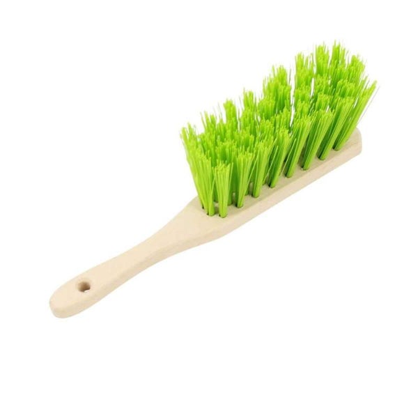 Der Handfeger besteht aus Holz und hat grüne Elaston-Borsten. Die Stiellänge beträgt ca. 28 cm. Er ist sowohl für drinnen als auch für draußen geeignet und somit ideal für Haushalt und Garten.