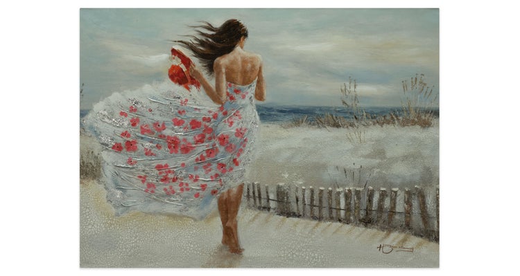 Ein 'Umhüllender Wind' umgarnt die junge Frau, die bei einem einsamen Spaziergang am Strand in Gedanken versunken ist. Ihr buntes Kleid spiegelt in Kombination mit dem handgemalten Silberglanz Leichtigkeit wider. Stellen Sie sich den salzigen Duft vor und lassen Sie sich von der Ausstrahlungskraft dieses Acrylgemäldes ans Meer bringen. Ihr handgemaltes Gemälde erhalten Sie in der Größe 100x70cm. Anders als bei minderwertigen Drucken auf Leinwand können Sie auf unseren Unikaten jeden Pinselstrich fühlen.