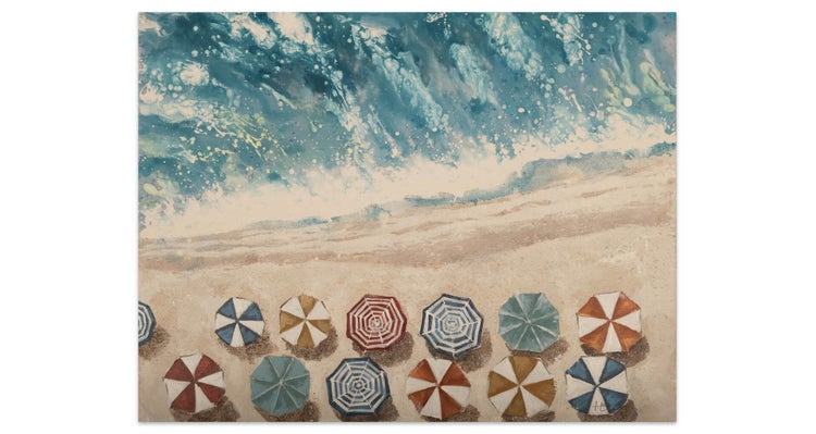 Das Acrylgemälde verspricht einen sonnigen Tag voller 'Erholung am Meer'. Strahlendes Blau mischt sich mit sanftem Beige und wirkt durch die fröhlichen Farbtupfen der Sonnenschirme vervollständigt. Die reliefartige Oberflächenstruktur verleiht dem handgemalten Kunstwerk Tiefe und Intensität. Holen Sie sich pure Urlaubsstimmung in Ihr Wohnzimmer. Ihr handgemaltes Gemälde erhalten Sie in der Größe 100x75cm. Anders als bei minderwertigen Drucken auf Leinwand können Sie auf unseren Unikaten jeden Pinselstrich fühlen.