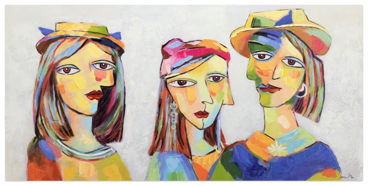 Das Acrylgemälde 'Picasso's Musen' erinnert in seiner handgemalten Maltechnik an die großen Werke des spanischen Künstlers. Wichtige Frauen in seinem Leben und die eigenen Kinder inspirierten den Maler zu vielen seiner Gemälde. Einzigartig in seiner Bildsprache wertet das Bild mit grau strukturierter Leinwand und buntem Motiv Ihr Wohnzimmer auf. Ihr handgemaltes Gemälde erhalten Sie in der Größe 120x60cm. Anders als bei minderwertigen Drucken auf Leinwand können Sie auf unseren Unikaten jeden Pinselstrich fühlen.