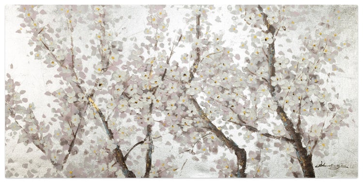 Weiße Blüten blühen wie edle Perlen auf dem Acrylgemälde 'Pearls in Bloom' und läuten die ersten Sommertage des Jahres ein. Die handgemalte Qualität mit der Silberglanzverzierung und die natürlichen Farben des Bildes bringen Frische in Ihr Schlafzimmer und machen Ihr Zuhause zu einer Oase der Ruhe, in der Sie sich Ihren Träumen hingeben können. Ihr handgemaltes Gemälde erhalten Sie in der Größe 120x60cm. Anders als bei minderwertigen Drucken auf Leinwand können Sie auf unseren Unikaten jeden Pinselstrich fühlen.