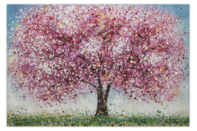 Auf dem imposanten Acrylgemälde 'Rooted Spirit' entsteht aus rosa Farbspritzern und Goldglanz ein blühender Baum in einer unglaublichen Größe. Unter einem blauen Himmelszelt stahlt das handgemalte Motiv pure Lebensfreude aus und verwandelt Ihr Esszimmer in einen Ort, an dem Sie ebenso wie Ihre Gäste sich in sommerlicher Leichtigkeit wohlfühlen werden. Ihr handgemaltes Gemälde erhalten Sie in der Größe 120cm x 80cm. Anders als bei minderwertigen Drucken auf Leinwand können Sie auf unseren Unikaten jeden Pinselstrich fühlen.