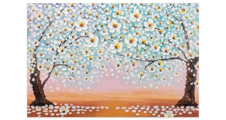 Ein 'Lauer Sommerabend' strahlt von diesem handgemalten Acrylgemälde in Ihr Wohnzimmer und verleiht Ihrem Raum eine romantische Atmosphäre. Die Abendsonne färbt das Firmament in ein magisches Farbenspiel in Nuancen von Orange und Rosa. Im sanften Sommerwind tanzen die expressiven Blüten in Weiß und schmücken die zwei eindrucksvollen Bäume. Ihr handgemaltes Gemälde erhalten Sie in der Größe 120x80cm. Anders als bei minderwertigen Drucken auf Leinwand können Sie auf unseren Unikaten jeden Pinselstrich fühlen.