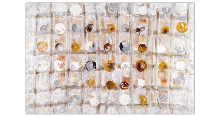 Das abstrakte Muster aus Kreisen und einem Gitternetz wird durch die stimmige Farbgebung aus Silber, Gold und Beige veredelt. Die golden glänzenden Farbelemente in 'Im Einklang mit mir selbst' laden in Ihrem Café immer wieder aufs Neue zum Verweilen ein. In Ihrem Wohnzimmer fügt sich das Gemälde in die geschmackvolle Einrichtung ein. Ihr handgemaltes Gemälde erhalten Sie in der Größe 120x80cm. Anders als bei minderwertigen Drucken auf Leinwand können Sie auf unseren Unikaten jeden Pinselstrich fühlen.