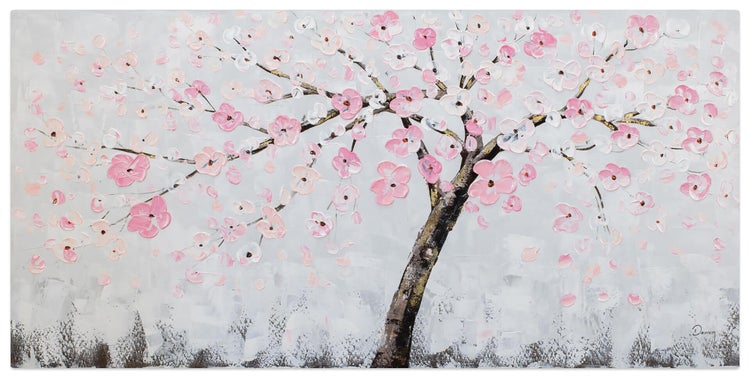 Auf einem Hintergrund in Grau erblühen in Rosatönen handgemalte Kirschblüten, die in Japan als Symbol der Schönheit gelten. Die Blüten erhalten durch die strukturreiche Oberfläche einen 3D-artigen Effekt und wirken fast so, als würden sie aus dem Acrylgemälde ragen. Verwandeln Sie Ihr Wohnzimmer in einen harmonischen 'Kirschblütentraum'. Ihr handgemaltes Gemälde erhalten Sie in der Größe 123x63cm. Anders als bei minderwertigen Drucken auf Leinwand können Sie auf unseren Unikaten jeden Pinselstrich fühlen.