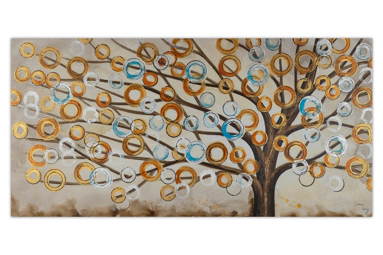 Leicht beschwingt tanzen die bunten Kreise in Metallic-Optik über das Acrylbild 'Herbstblues' und heben sich von dem schlichten Grund ab - ein Sinnbild für das ewige Leben. Verschönern Sie mit diesem Werk Ihr Wohnzimmer oder Büro und stellen Sie Ihr Auge fürs Detail unter Beweis. Diesem Charme können sich auch Ihre Gäste nicht entziehen. Ihr handgemaltes Gemälde erhalten Sie in der Größe 140x70cm. Anders als bei minderwertigen Drucken auf Leinwand können Sie auf unseren Unikaten jeden Pinselstrich fühlen.