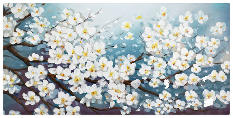 Glamour in White' ist ein Ausschnitt aus dem Märchenwald. Ein langer Zweig klettert durch das Acrylbild und trägt seine Kirschblüten zum Himmel. Der Hintergrund leuchtet blau und untermalt die Lebendigkeit des Schauspiels. Edler Silberglanz rundet das Zusammenspiel ab. Schöpfen Sie Kraft aus diesem Gemälde in Ihrer Praxis oder dem Büro! Ihr handgemaltes Gemälde erhalten Sie in der Größe 140cm x 70cm. Anders als bei minderwertigen Drucken auf Leinwand können Sie auf unseren Unikaten jeden Pinselstrich fühlen.
