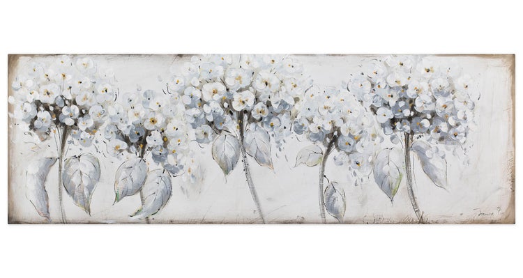 Zart im Wind' bewegen sich die filigranen Blüten auf Ihrem neuen Acrylbild. Ein Arrangement aus fünf Blumen in zurückhaltenden Grautönen bringt die Natur stilvoll in Ihre Praxis. Durch seine ruhigen Farben sorgt das handgemalte Unikat auch in Ihrem Büro für entspannte Stimmung und ist die perfekte Dekoration für Ihr Wohnzimmer. Ihr handgemaltes Gemälde erhalten Sie in der Größe 150x50cm. Anders als bei minderwertigen Drucken auf Leinwand können Sie auf unseren Unikaten jeden Pinselstrich fühlen.