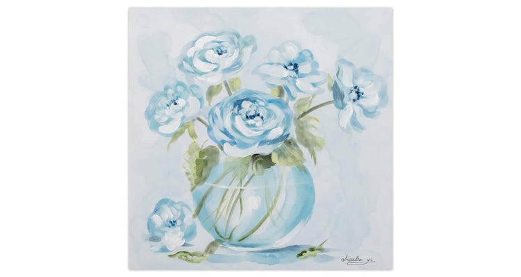Das handgemalte Acrylgemälde 'Poesie und Blumen' zeigt wunderschöne Blumen in Blau und Weiß, die in einer gläsernen Vase arrangiert sind. Erleben Sie in Ihrem Wohnzimmer tagtäglich die Harmonie der blühenden Pracht, die Ihnen stets das Gefühl der Ruhe schenken. Im Einklang strahlen die Blüten eine positive Energie aus, die Ihre Räume mit Leben füllen. Ihr handgemaltes Gemälde erhalten Sie in der Größe 60x60cm. Anders als bei minderwertigen Drucken auf Leinwand können Sie auf unseren Unikaten jeden Pinselstrich fühlen.