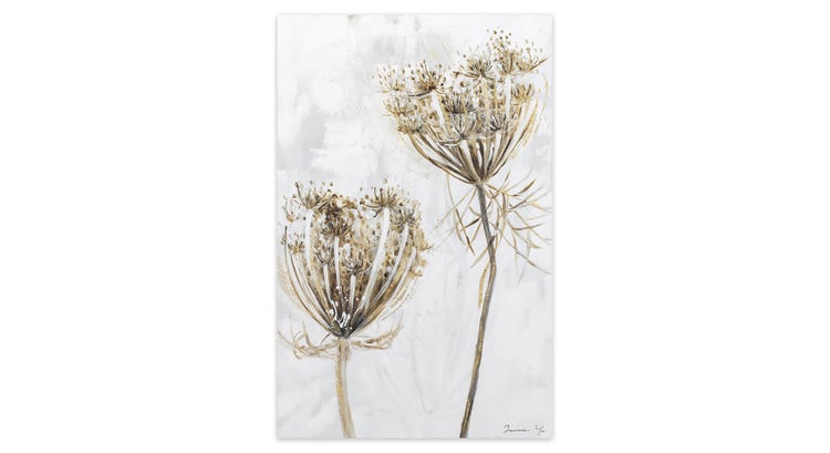 Hinter einem dichten Nebel in Grau versteckt sich der Eingang ins Paradies, der nur anhand der zwei 'Growing Flowers' zu erkennen ist. Die magischen Blumen erstrahlen in goldglänzender Pracht und in einer Verbeugung begrüßen sie ihre Betrachter. Träumen Sie in Ihrem Schlafzimmer mit diesem handgemalten Acrylgemälde vom Zauber des Garten Eden. Ihr handgemaltes Gemälde erhalten Sie in der Größe 60x90cm. Anders als bei minderwertigen Drucken auf Leinwand können Sie auf unseren Unikaten jeden Pinselstrich fühlen.