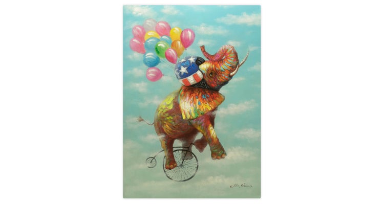 Lassen Sie sich anstecken von der guten Laune von 'Fiodor Fröhlich'. Der handgemalte Elefant schwebt auf einem Fahrrad durch die Lüfte, getragen von kunterbunten Luftballons. Das Acrylgemälde begeistert sowohl Kinder als auch Erwachsene und regt die Phantasie an. Die reliefartige Oberflächenstruktur erweckt den fröhlichen Elefanten in Ihrem Kinderzimmer zum Leben. Ihr handgemaltes Gemälde erhalten Sie in der Größe 70x100cm. Anders als bei minderwertigen Drucken auf Leinwand können Sie auf unseren Unikaten jeden Pinselstrich fühlen.