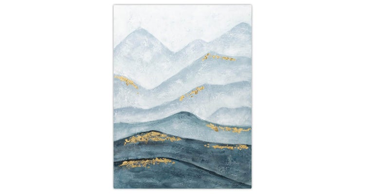Verzauberte Berge' reihen sich parallel aneinander auf einem Hintergrund in Grau und erinnern an die Dynamik des Meeres. Die handgemalten Berge in Petroltönen reflektieren die Ruhe einer unberührten Natur, überzogen mit goldglänzenden Pfaden. Dieses Acrylgemälde gibt Ihrem Flur ein Gefühl von Spiritualität und Verbundenheit mit der Wildnis. Ihr handgemaltes Gemälde erhalten Sie in der Größe 75x100cm. Anders als bei minderwertigen Drucken auf Leinwand können Sie auf unseren Unikaten jeden Pinselstrich fühlen.
