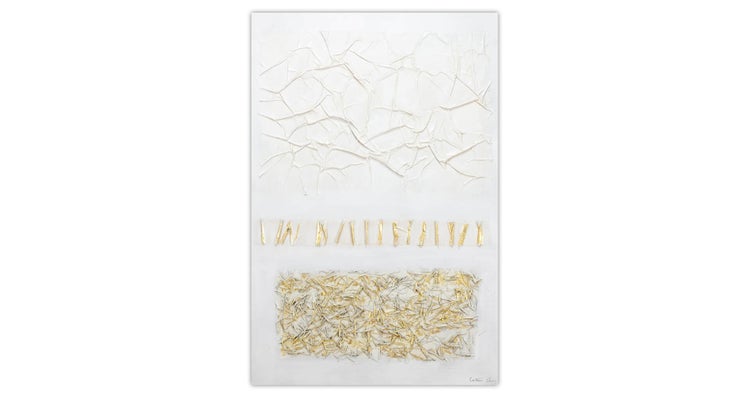 Die 'Goldene Saat' ausdrucksreicher Kunst präsentiert sich auf diesem handgemalten Acrylgemälde, dessen Holz- und Papierelemente sich plastisch eindrucksvoll von der Leinwand abheben. In Ihrem Wohnzimmer beweisen Sie Ihren Gästen, dass die abstrakte Darstellung auf dem Leinwandbild in Weiß und Gold den Betrachter in Erstaunen versetzt. Ihr handgemaltes Gemälde erhalten Sie in der Größe 80x120cm. Anders als bei minderwertigen Drucken auf Leinwand können Sie auf unseren Unikaten jeden Pinselstrich fühlen.