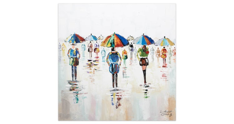 Süße Regengüsse' prasseln auf die Menschen herab, doch dank der bunten Regenschirme kommt auf dem handgemalten Acrylbild trotzdem keine schlechte Stimmung auf. Vielmehr strahlt die Motivik, die wie aus dem Leben gegriffen scheint, eine ansteckende Gemütlichkeit aus, die sich in Ihr Wohnzimmer überträgt und zu mehr Gelassenheit animiert. Ihr handgemaltes Gemälde erhalten Sie in der Größe 80x80cm. Anders als bei minderwertigen Drucken auf Leinwand können Sie auf unseren Unikaten jeden Pinselstrich fühlen.